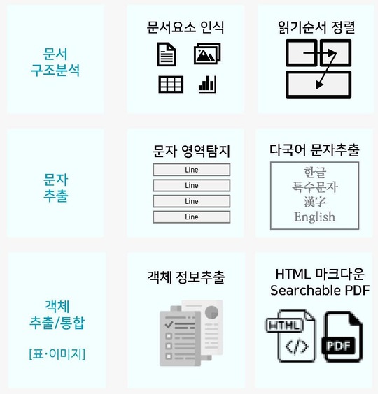 '문서 구조분석 및 객체 정보추출모델'과 결합하여 복잡한 문서의 레이아웃을 이해하고 구조적 정보를 보존하면서 주요 텍스트를 추출합니다.